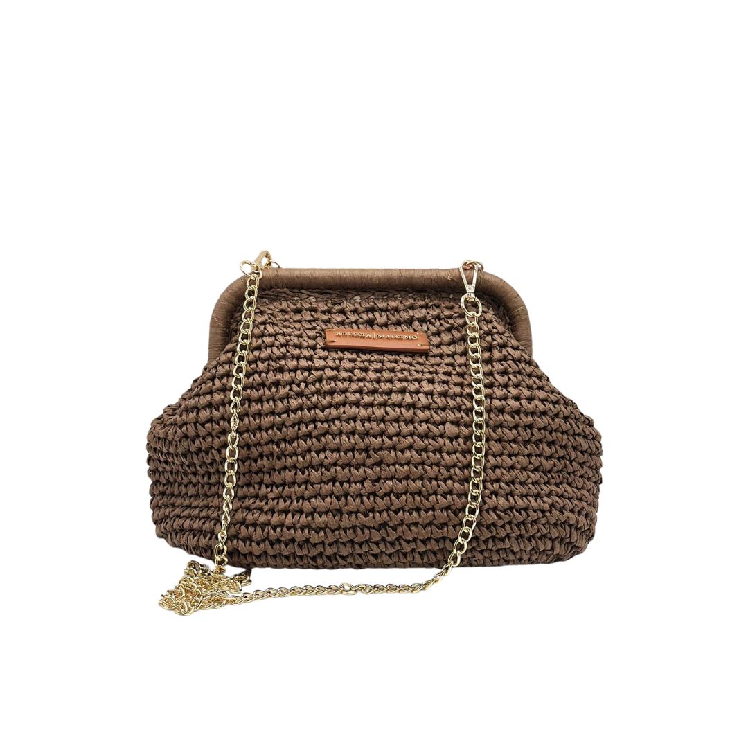 Carteira Alessia Massimo 8123 em rafia natural, combinando elegância e funcionalidade. O design sofisticado em castanho oferece versatilidade para qualquer ocasião, enquanto a alça em corrente proporciona conforto e estilo ao transportar. Perfeita para quem valoriza peças de qualidade com acabamento refinado.